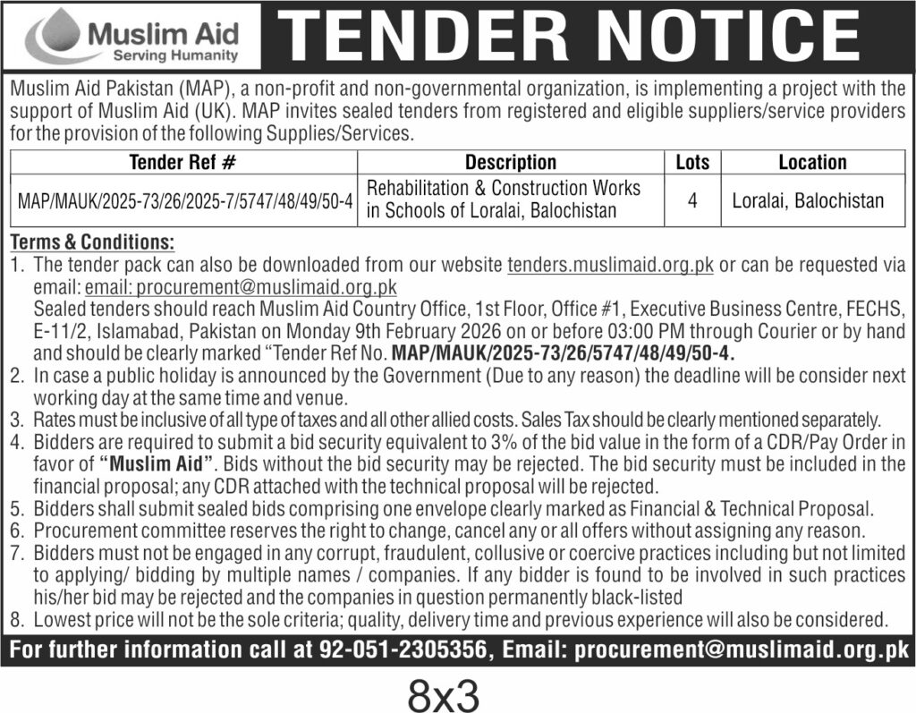Warning: Constant WP_FILE_MANAGER_PATH already defined in /home/u158617209/domains/muslimaid.org.pk/public_html/tenders/wp-content/plugins/wp-file-manager/file_folder_manager.php on line 17 MAP/MAUK/2025-73/26/5747/48/49/50-4 — Rehabilitation & Construction Work in Schools of District Loralai Balochistan – Tenders Muslim AidSkip to content