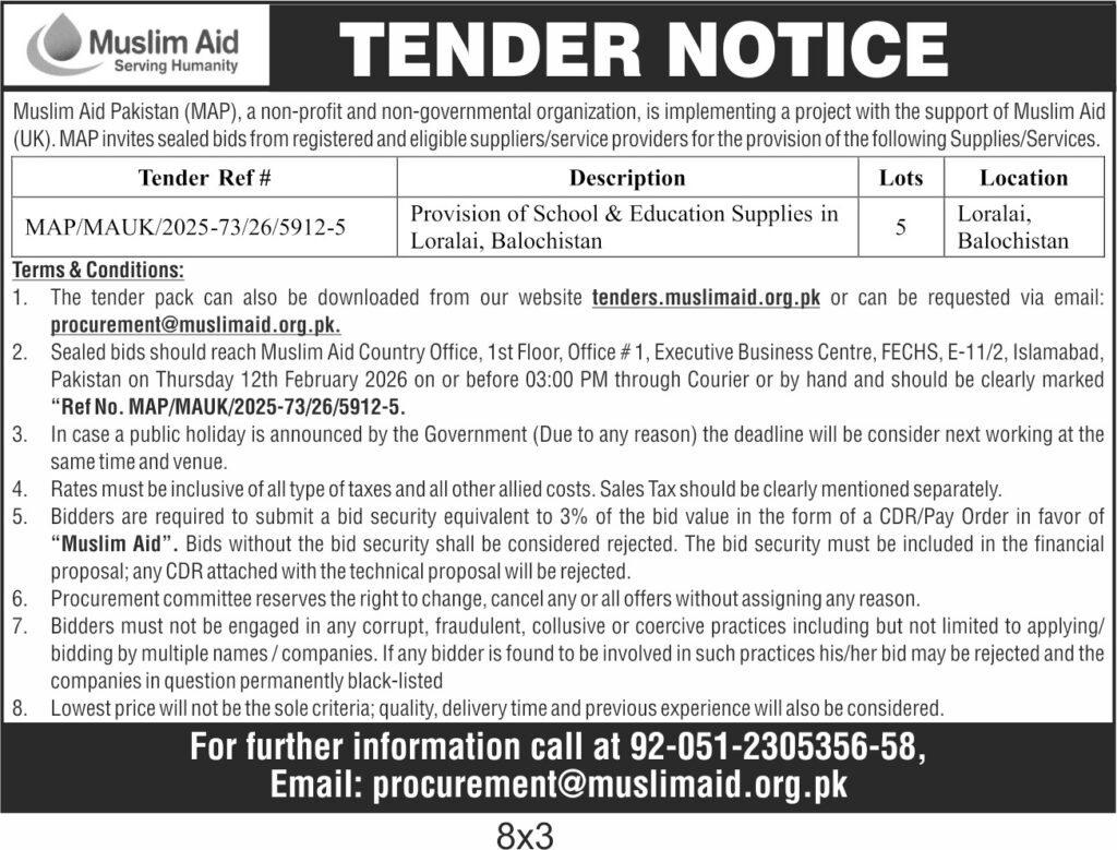Warning: Constant WP_FILE_MANAGER_PATH already defined in /home/u158617209/domains/muslimaid.org.pk/public_html/tenders/wp-content/plugins/wp-file-manager/file_folder_manager.php on line 17 MAP/MAUK/2025-73/26/5912-5 — Provision of Educational & School Supplies in 5 Schools of District Loralai Balochistan – Tenders Muslim AidSkip to content
