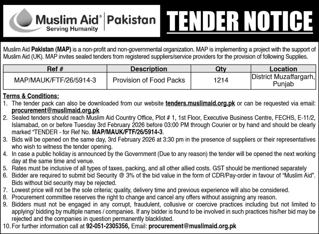 Warning: Constant WP_FILE_MANAGER_PATH already defined in /home/u158617209/domains/muslimaid.org.pk/public_html/tenders/wp-content/plugins/wp-file-manager/file_folder_manager.php on line 17 MAP/MAUK/FTF/26/5914-3 — Provision of RAMADAN FOOD PACK 2026 in District MuzaffarGarh Punjab – Tenders Muslim AidSkip to content