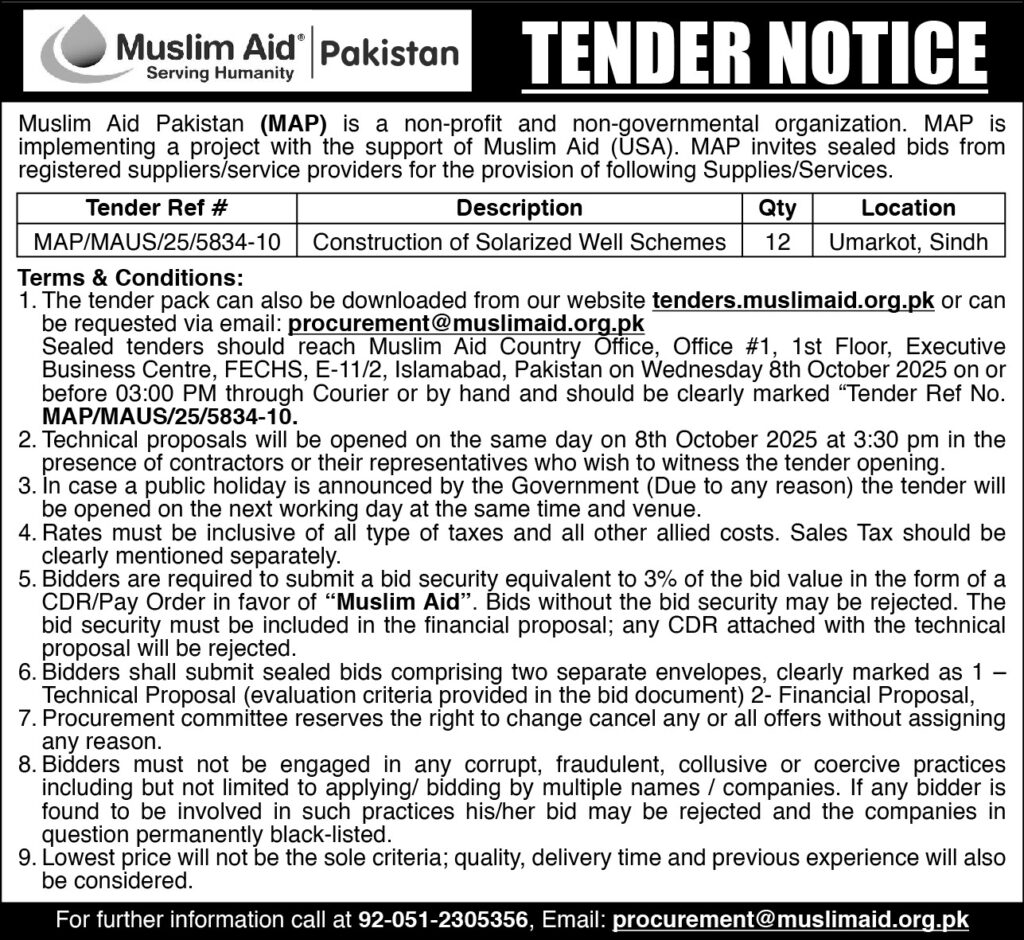 Warning: Constant WP_FILE_MANAGER_PATH already defined in /home/u158617209/domains/muslimaid.org.pk/public_html/tenders/wp-content/plugins/wp-file-manager/file_folder_manager.php on line 17 MAP/MAUS/25/5834-10 — Construction of Solarized Well Schemes in District Umarkot Sindh – Tenders Muslim AidSkip to content